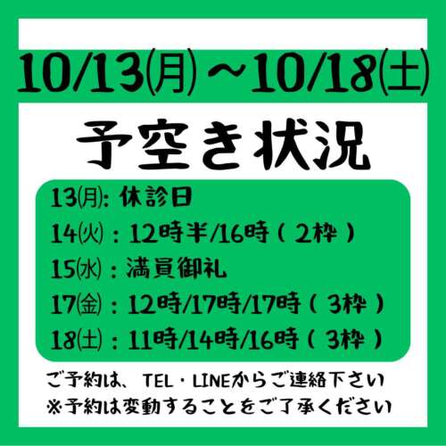 2025年10月11日2025.10/13~10/18までの予約空き状況です。