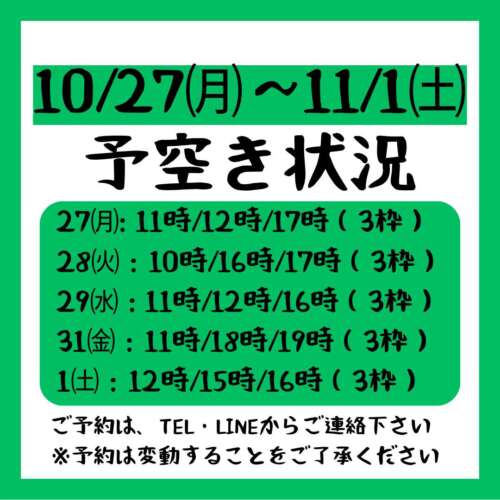 2025年10月25日2025.10/27~11/1までの予約空き状況です。