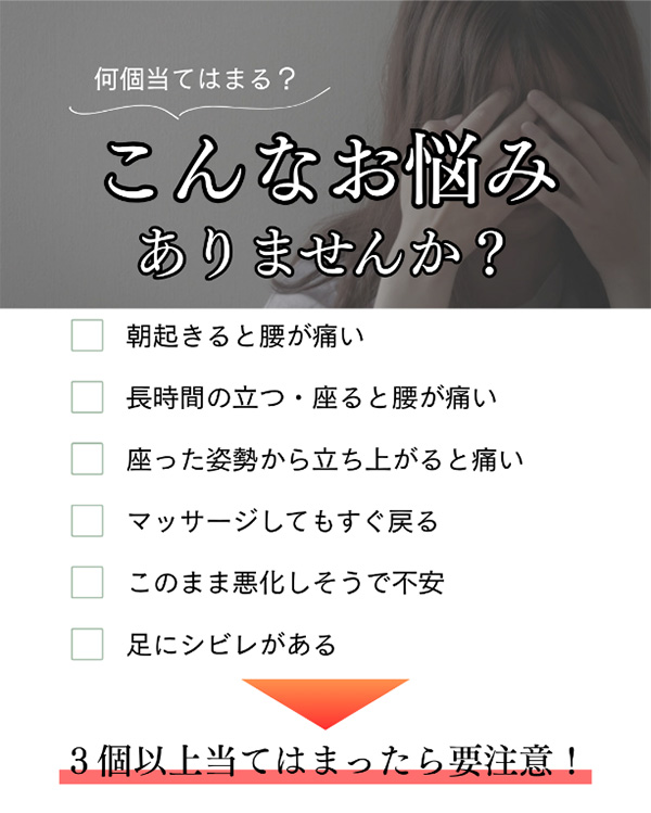 悩み箇所・症状: 腰痛 腰1回目から腰が痛くなくなって嬉しかったです。